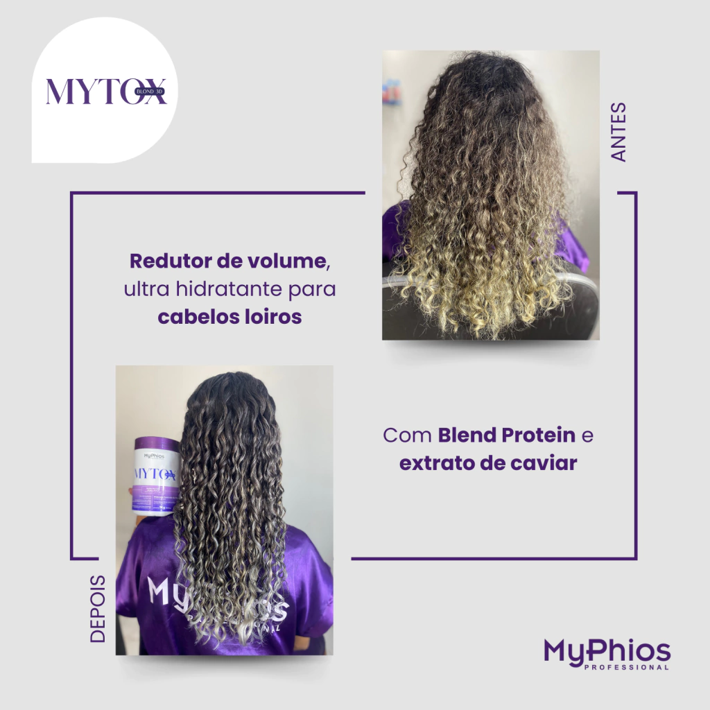 O mytox da MyPhios é uma máscara ultra hidratante para cabelos loiros. Trata cabelos indisciplinados, faz correção de falhas na fibra capilar, reposição de massa, rejuvenescimento dos fios, neutraliza tons indesejados.